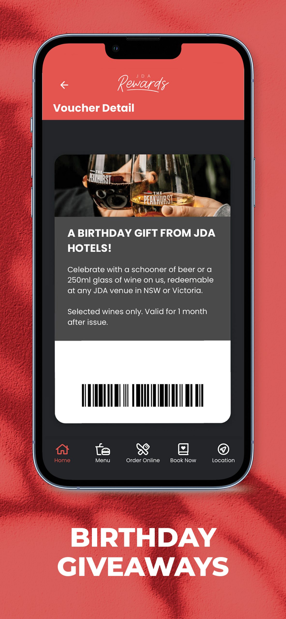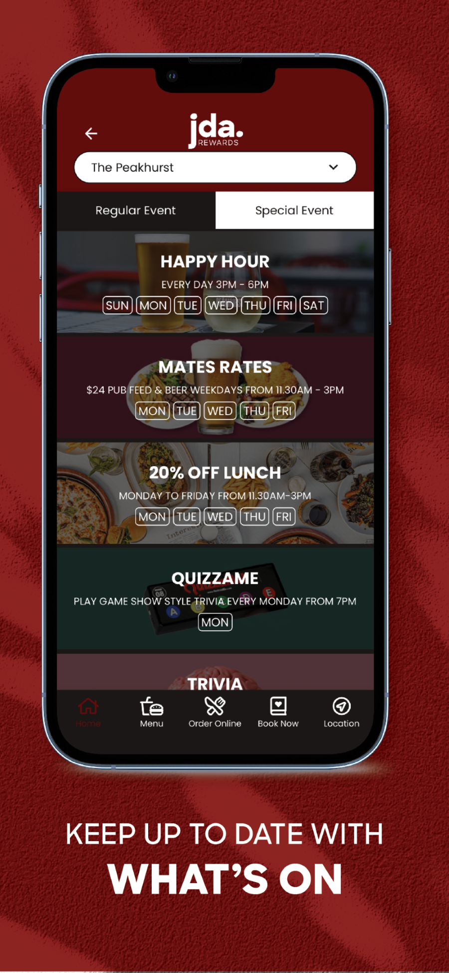 Sign up now to start receiving benefits on the JDA Rewards app and receive a FREE drink upon sign up. If you’re already a member, scan your app at the till to access all The Peakhurst member benefits including: