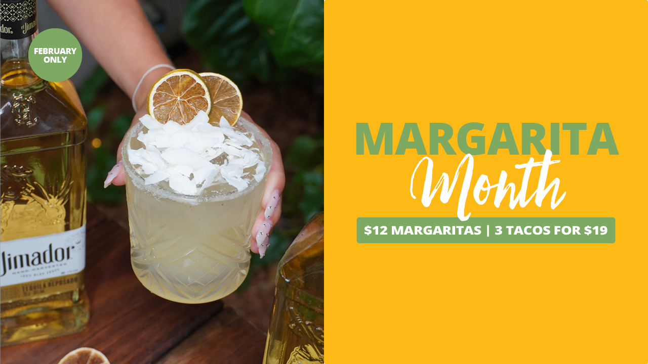 February is officially Margarita Month! All month long, enjoy $12 margaritas and 3 tacos for $19, available throughout February. We’re also hosting a Margarita Pop-Up in the Pavilion.